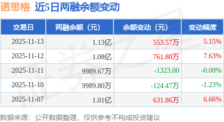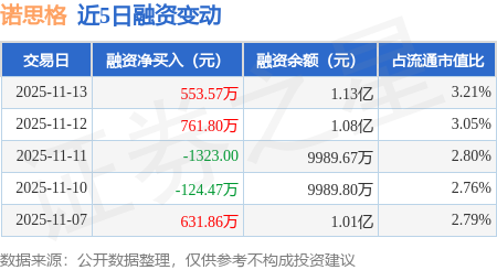 证券之星消息,11月13日,诺思格(301333)融资买入1463.29万元,融资偿还909.72万元,融资净买入553.57万元,融资余额1.13亿元。