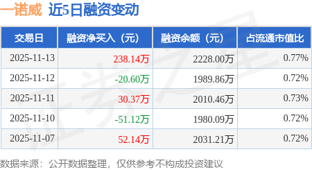 证券之星消息,11月13日,一诺威(920261)融资买入668.75万元,融资偿还430.61万元,融资净买入238.14万元,融资余额2228.0万元,近20个交易日中有12个交易日出现融资净买入。