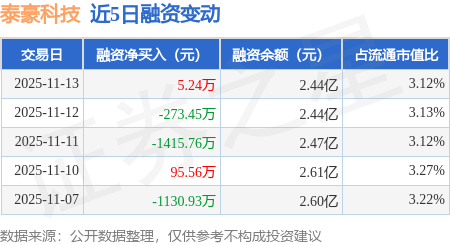 证券之星消息,11月13日,泰豪科技(600590)融资买入780.7万元,融资偿还775.46万元,融资净买入5.24万元,融资余额2.44亿元。