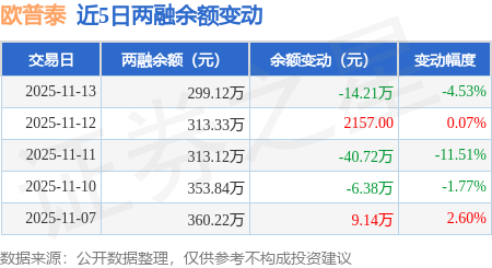 证券之星消息,11月13日,欧普泰(920414)融资买入0.42万元,融资偿还14.63万元,融资净卖出14.21万元,融资余额299.12万元。