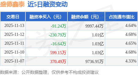 证券之星消息,11月13日,盛德鑫泰(300881)融资买入1431.14万元,融资偿还1522.38万元,融资净卖出91.24万元,融资余额9997.44万元。