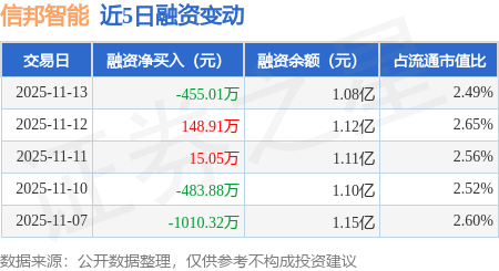 证券之星消息,11月13日,信邦智能(301112)融资买入730.55万元,融资偿还1185.56万元,融资净卖出455.01万元,融资余额1.08亿元。