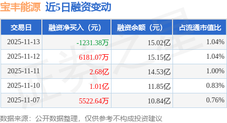 证券之星消息,11月13日,宝丰能源(600989)融资买入1.4亿元,融资偿还1.52亿元,融资净卖出1231.38万元,融资余额15.02亿元,近20个交易日中有12个交易日出现融资净买入。