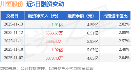 证券之星消息,11月13日,川恒股份(002895)融资买入1.03亿元,融资偿还2.94亿元,融资净卖出1.91亿元,融资余额4.59亿元,近20个交易日中有13个交易日出现融资净买入。