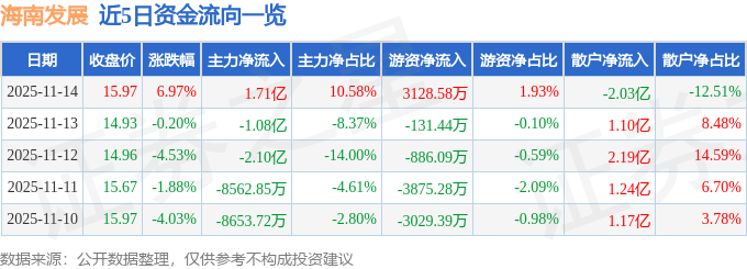 11月14日的资金流向数据方面,主力资金净流入1.71亿元,占总成交额10.58%,游资资金净流入3128.58万元,占总成交额1.93%,散户资金净流出2.03亿元,占总成交额12.51%。