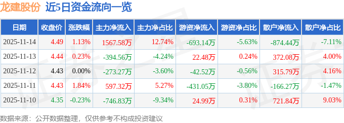 龙建股份(600853)11月14日主力资金净买入1567.58万元