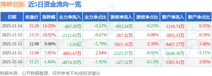 证券之星消息,截至2025年11月14日收盘,海峡创新(300300)报收于15.2元,上涨14.2%,换手率36.02%,成交量240.17万手,成交额34.87亿元。