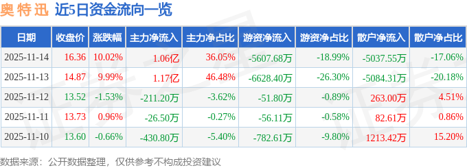 证券之星消息,截至2025年11月14日收盘,奥 特 迅(002227)报收于16.36元,上涨10.02%,已连续涨停2天,换手率7.45%,成交量18.32万手,成交额2.95亿元。
