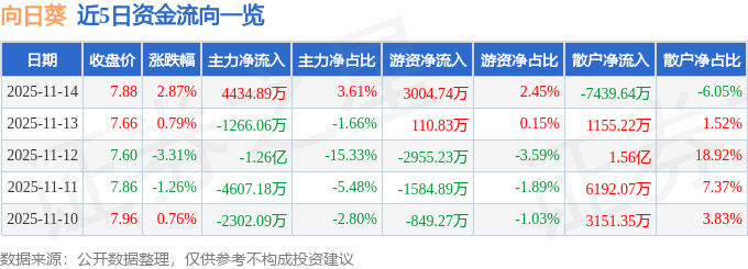 证券之星消息,截至2025年11月14日收盘,向日葵(300111)报收于7.88元,上涨2.87%,换手率11.95%,成交量153.81万手,成交额12.29亿元。