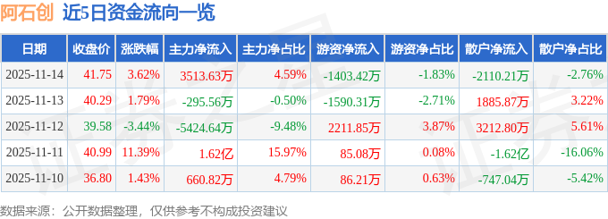 证券之星消息,截至2025年11月14日收盘,阿石创(300706)报收于41.75元,上涨3.62%,换手率16.2%,成交量18.39万手,成交额7.66亿元。