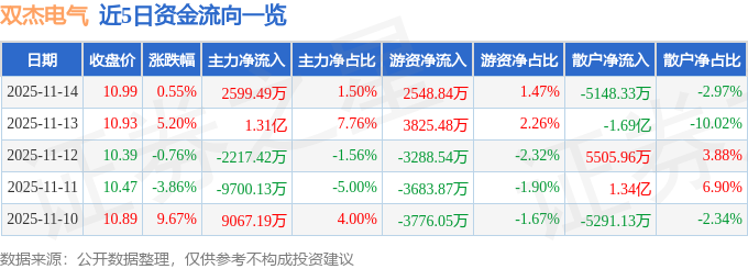 证券之星消息,截至2025年11月14日收盘,双杰电气(300444)报收于10.99元,上涨0.55%,换手率25.58%,成交量158.97万手,成交额17.35亿元。
