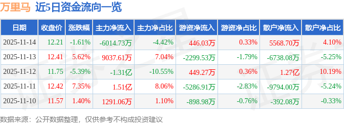 证券之星消息,截至2025年11月14日收盘,万里马(300591)报收于12.21元,下跌1.61%,换手率31.05%,成交量108.82万手,成交额13.6亿元。