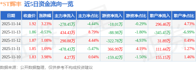 证券之星消息,截至2025年11月14日收盘,*ST辉丰(002496)报收于1.92元,上涨3.23%,换手率2.96%,成交量32.95万手,成交额6264.64万元。