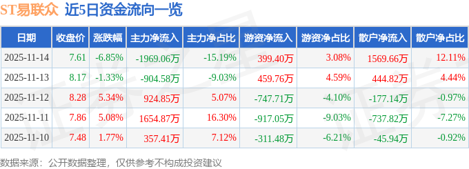 证券之星消息,截至2025年11月14日收盘,ST易联众(300096)报收于7.61元,下跌6.85%,换手率3.95%,成交量16.96万手,成交额1.3亿元。
