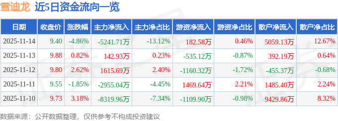 证券之星消息,截至2025年11月14日收盘,雪迪龙(002658)报收于9.4元,下跌4.86%,换手率11.71%,成交量42.0万手,成交额3.99亿元。