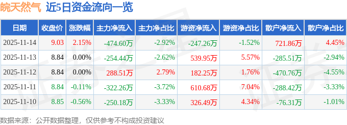证券之星消息,截至2025年11月14日收盘,皖天然气(603689)报收于9.03元,上涨2.15%,换手率3.57%,成交量18.13万手,成交额1.62亿元。