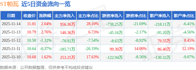 证券之星消息,截至2025年11月14日收盘,ST帕瓦(688184)报收于11.01元,上涨2.04%,换手率3.08%,成交量3.1万手,成交额3403.59万元。