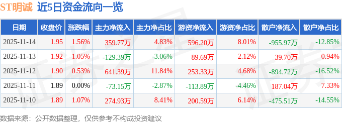 证券之星消息,截至2025年11月14日收盘,ST明诚(600136)报收于1.95元,上涨1.56%,换手率1.98%,成交量38.41万手,成交额7441.57万元。