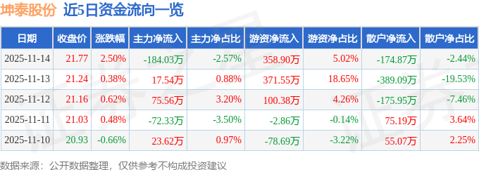 证券之星消息,截至2025年11月14日收盘,坤泰股份(001260)报收于21.77元,上涨2.5%,换手率10.38%,成交量3.29万手,成交额7155.73万元。