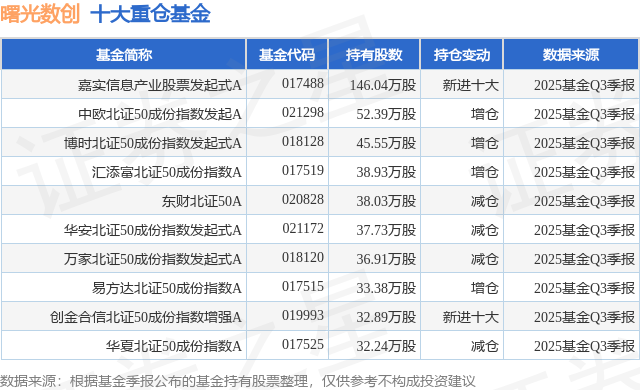 根据2025基金Q3季报公募基金重仓股数据,重仓该股的公募基金共31家,其中持有数量最多的公募基金为嘉实基金的嘉实信息产业股票发起式A。嘉实信息产业股票发起式A目前规模为7.2亿元,最新净值2.2562(11月13日),较上一交易日上涨0.64%,近一年上涨38.74%。该公募基金现任基金经理为李涛。李涛在任的基金产品包括:嘉实清洁能源股票发起式A,管理时间为2022年11月22日至今,期间收益率为15.54%;嘉实积极配置一年持有混合A,管理时间为2022年11月29日至今,期间收益率为51.41%;嘉实品质优选股票A,管理时间为2024年12月14日至今,期间收益率为41.45%。