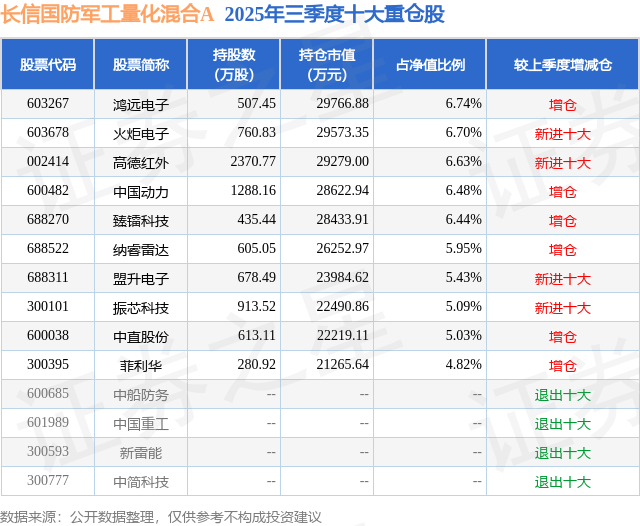 根据2025基金Q3季报公募基金重仓股数据,重仓该股的公募基金共11家,其中持有数量最多的公募基金为长信基金的长信国防军工量化混合A。长信国防军工量化混合A目前规模为9.05亿元,最新净值1.6039(11月13日),较上一交易日上涨0.94%,近一年上涨23.39%。该公募基金现任基金经理为宋海岸。宋海岸在任的基金产品包括:长信中证500指数增强A,管理时间为2018年2月12日至今,期间收益率为110.79%;长信沪深300指数增强A,管理时间为2019年5月16日至今,期间收益率为78.95%;长信先进装备三个月持有混合A,管理时间为2021年11月29日至今,期间收益率为-12.0%。