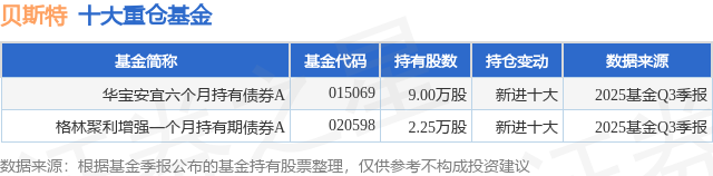 根据2025基金Q3季报公募基金重仓股数据,重仓该股的公募基金共2家,其中持有数量最多的公募基金为华宝基金的华宝安宜六个月持有债券A。华宝安宜六个月持有债券A目前规模为0.71亿元,最新净值1.1371(11月13日),较上一交易日上涨0.04%,近一年上涨6.46%。该公募基金现任基金经理为李栋梁。李栋梁在任的基金产品包括:华宝宝康债券A,管理时间为2011年6月28日至今,期间收益率为86.89%;华宝可转债债券A,管理时间为2016年6月1日至今,期间收益率为94.3%;华宝新飞跃灵活配置混合,管理时间为2017年2月27日至今,期间收益率为137.92%;华宝双债增强债券A,管理时间为2021年4月23日至今,期间收益率为20.62%。