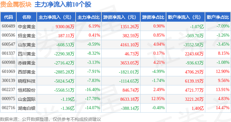 从资金流向上来看,当日贵金属板块主力资金净流出5.11亿元,游资资金净流入1.83亿元,散户资金净流入3.28亿元。贵金属板块个股资金流向见下表: