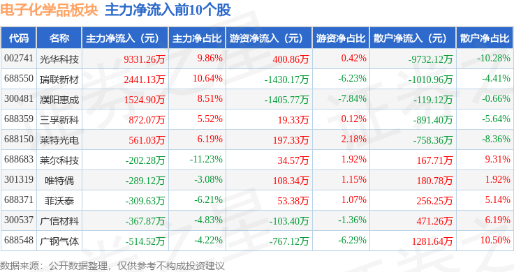 从资金流向上来看,当日电子化学品板块主力资金净流出8.79亿元,游资资金净流入2.23亿元,散户资金净流入6.56亿元。电子化学品板块个股资金流向见下表: