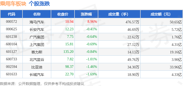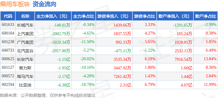 从资金流向上来看,当日乘用车板块主力资金净流出12.26亿元,游资资金净流入4.11亿元,散户资金净流入8.15亿元。乘用车板块个股资金流向见下表: