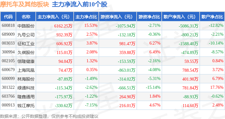 从资金流向上来看,当日摩托车及其他板块主力资金净流出156.77万元,游资资金净流入2103.63万元,散户资金净流出1946.85万元。摩托车及其他板块个股资金流向见下表: