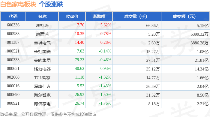证券之星消息,11月14日白色家电板块较上一交易日下跌0.74%,海信家电领跌。当日上证指数报收于3990.49,下跌0.97%。深证成指报收于13216.03,下跌1.93%。白色家电板块个股涨跌见下表: