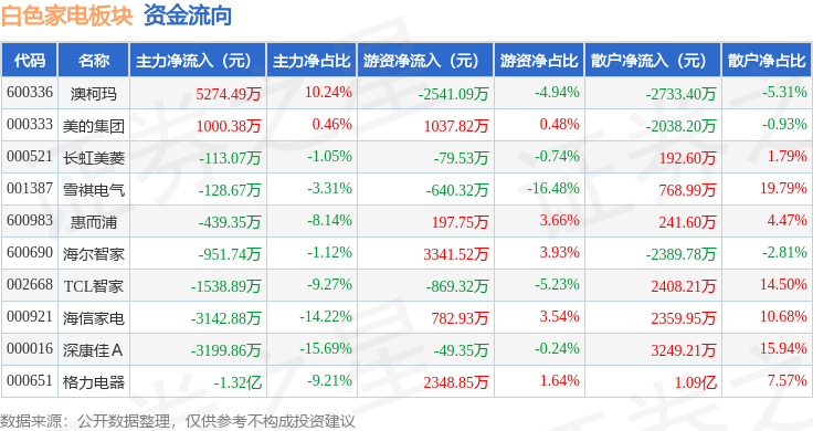 从资金流向上来看,当日白色家电板块主力资金净流出1.64亿元,游资资金净流入3529.24万元,散户资金净流入1.29亿元。白色家电板块个股资金流向见下表:
