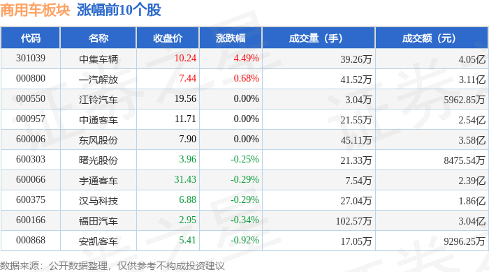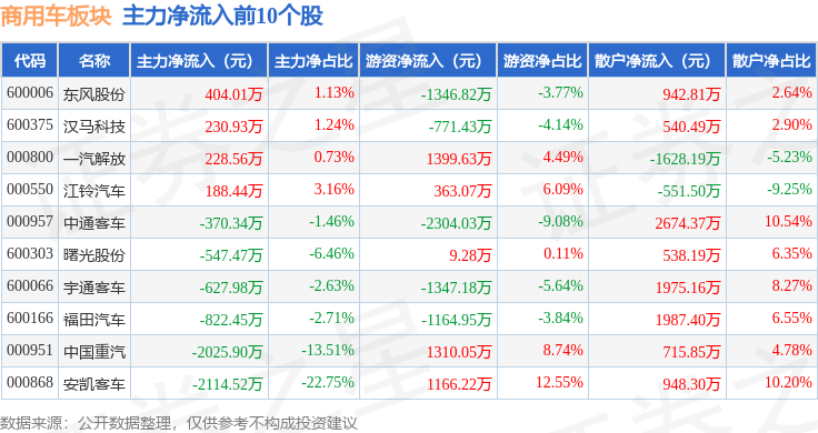 从资金流向上来看,当日商用车板块主力资金净流出3.01亿元,游资资金净流入1800.56万元,散户资金净流入2.83亿元。商用车板块个股资金流向见下表: