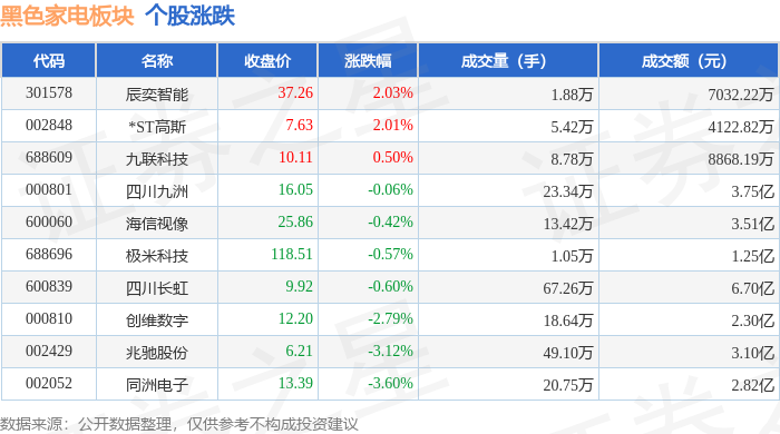 证券之星消息,11月14日黑色家电板块较上一交易日下跌1.25%,同洲电子领跌。当日上证指数报收于3990.49,下跌0.97%。深证成指报收于13216.03,下跌1.93%。黑色家电板块个股涨跌见下表: