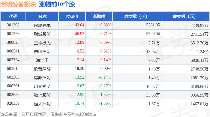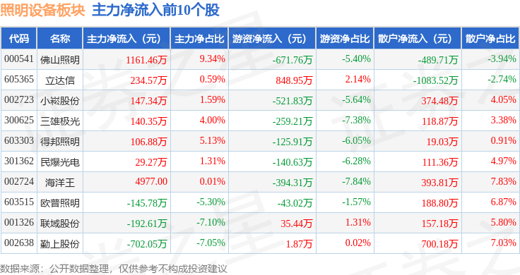 从资金流向上来看,当日照明设备板块主力资金净流出3136.34万元,游资资金净流出1350.15万元,散户资金净流入4486.49万元。照明设备板块个股资金流向见下表: