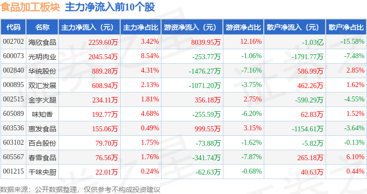 从资金流向上来看,当日食品加工板块主力资金净流出1.45亿元,游资资金净流入9277.02万元,散户资金净流入5271.42万元。食品加工板块个股资金流向见下表: