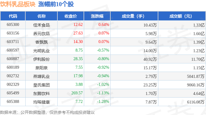 从资金流向上来看,当日饮料乳品板块主力资金净流出5.02亿元,游资资金净流入4635.98万元,散户资金净流入4.56亿元。饮料乳品板块个股资金流向见下表: