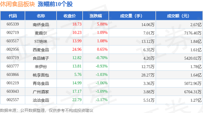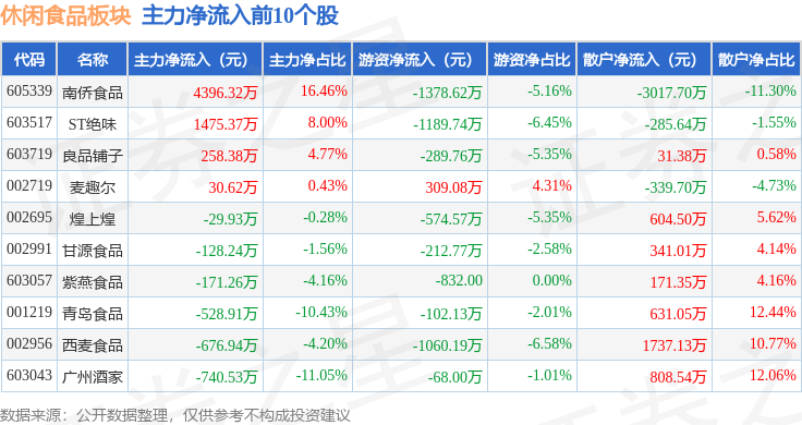 从资金流向上来看,当日休闲食品板块主力资金净流出2.07亿元,游资资金净流出7644.9万元,散户资金净流入2.83亿元。休闲食品板块个股资金流向见下表: