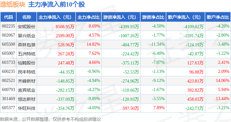 从资金流向上来看,当日造纸板块主力资金净流出1.03亿元,游资资金净流出6113.26万元,散户资金净流入1.64亿元。造纸板块个股资金流向见下表: