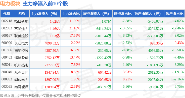 从资金流向上来看,当日电力板块主力资金净流出19.32亿元,游资资金净流入4.89亿元,散户资金净流入14.43亿元。电力板块个股资金流向见下表: