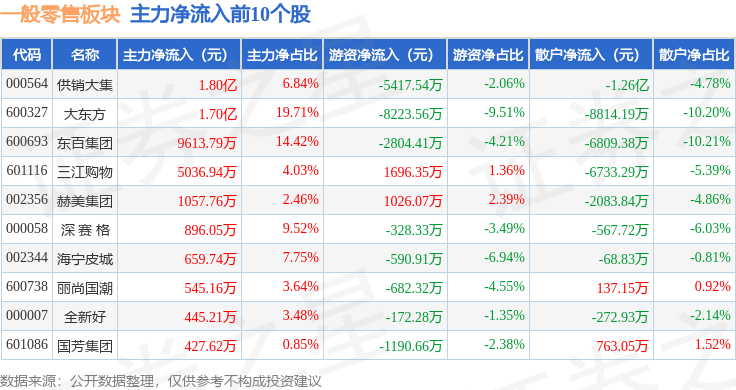 从资金流向上来看,当日一般零售板块主力资金净流出3.03亿元,游资资金净流出2.91亿元,散户资金净流入5.94亿元。一般零售板块个股资金流向见下表: