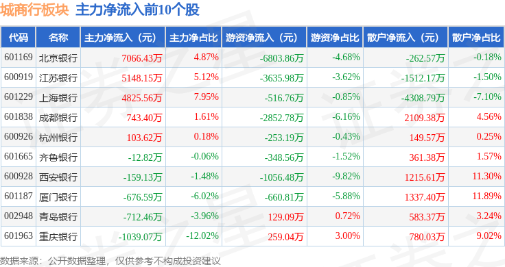 从资金流向上来看,当日城商行板块主力资金净流出1968.16万元,游资资金净流出5868.36万元,散户资金净流入7836.52万元。城商行板块个股资金流向见下表: