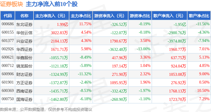 从资金流向上来看,当日证券板块主力资金净流出33.99亿元,游资资金净流入14.09亿元,散户资金净流入19.89亿元。证券板块个股资金流向见下表: