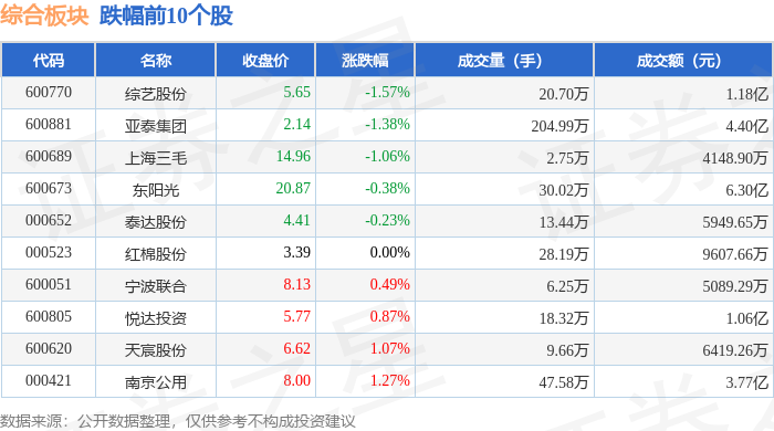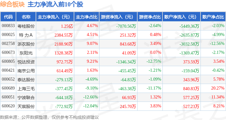 从资金流向上来看,当日综合板块主力资金净流出6045.92万元,游资资金净流出1194.47万元,散户资金净流入7240.39万元。综合板块个股资金流向见下表: