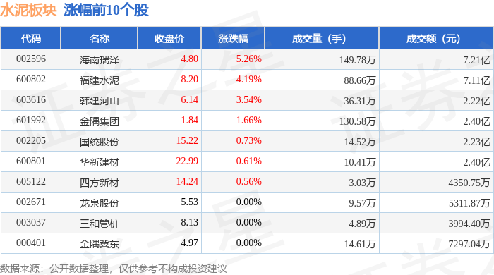 证券之星消息,11月14日水泥板块较上一交易日下跌0.22%,四川金顶领跌。当日上证指数报收于3990.49,下跌0.97%。深证成指报收于13216.03,下跌1.93%。水泥板块个股涨跌见下表: