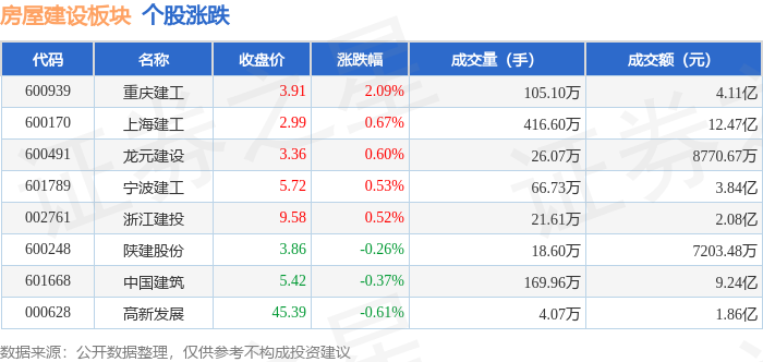 证券之星消息,11月14日房屋建设板块较上一交易日下跌0.16%,高新发展领跌。当日上证指数报收于3990.49,下跌0.97%。深证成指报收于13216.03,下跌1.93%。房屋建设板块个股涨跌见下表: