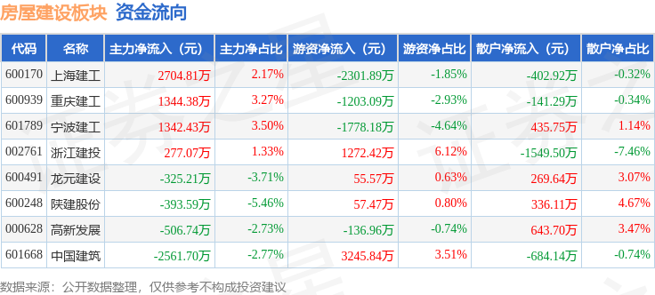 从资金流向上来看,当日房屋建设板块主力资金净流入1881.47万元,游资资金净流出788.82万元,散户资金净流出1092.64万元。房屋建设板块个股资金流向见下表: