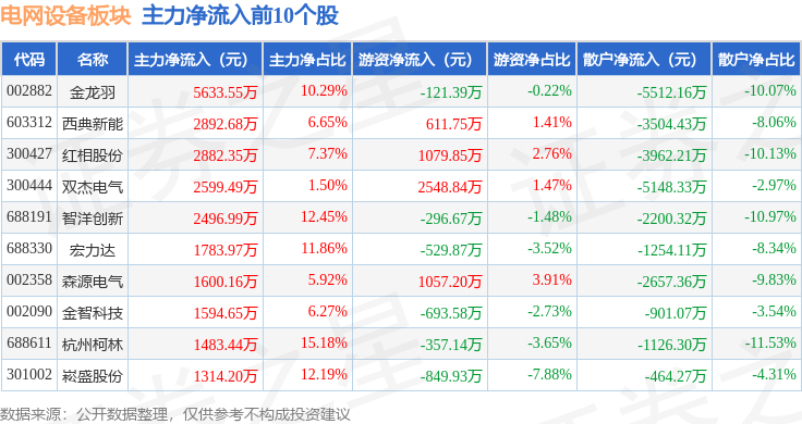 从资金流向上来看,当日电网设备板块主力资金净流出46.56亿元,游资资金净流入8.76亿元,散户资金净流入37.8亿元。电网设备板块个股资金流向见下表: