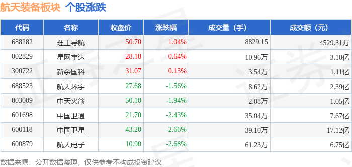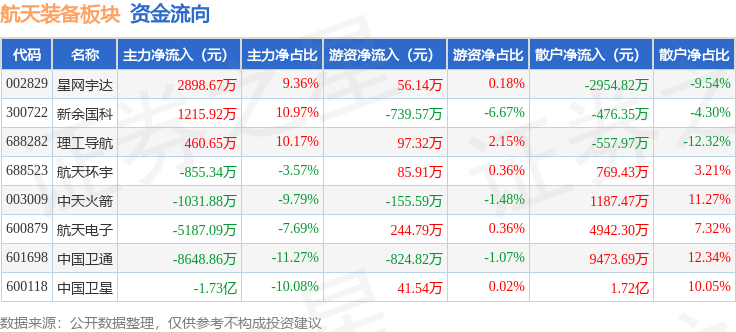 从资金流向上来看,当日航天装备板块主力资金净流出2.84亿元,游资资金净流出1194.26万元,散户资金净流入2.96亿元。航天装备板块个股资金流向见下表:
