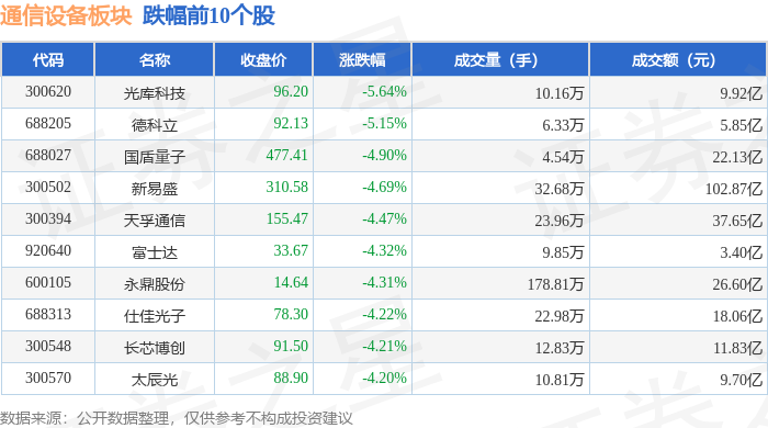 证券之星消息,11月14日通信设备板块较上一交易日下跌2.86%,光库科技领跌。当日上证指数报收于3990.49,下跌0.97%。深证成指报收于13216.03,下跌1.93%。通信设备板块个股涨跌见下表: